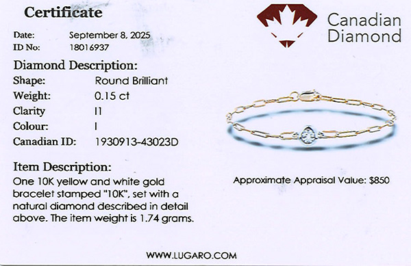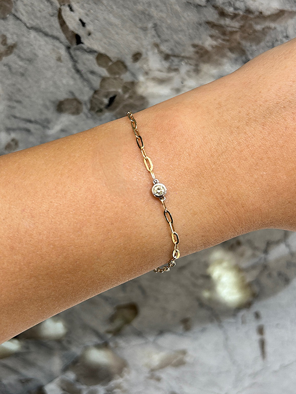 10K white and yellow gold paperclip chain bracelet featuring a 0.15 carat round brilliant cut Canadian diamond.