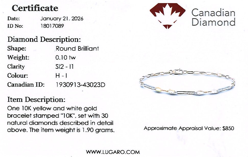 10K yellow & white gold bracelet featuring 0.10 carat total weight round brilliant cut diamonds.