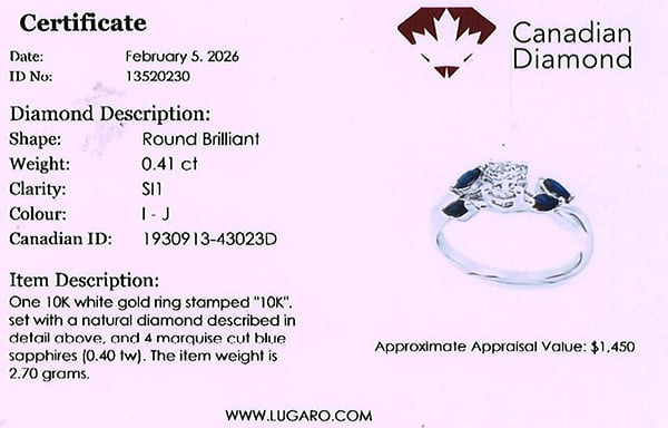 10K white gold ring featuring a 0.41 carat Canadian diamonds, accented by 0.40 carat sapphire.
