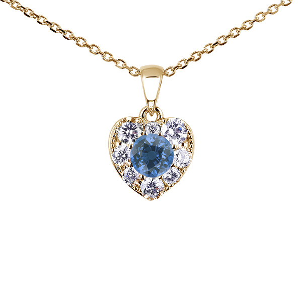 10K yellow gold heart shape halo pendant featuring a 0.32 carat round brilliant cut melee Canadian diamond, accented by 0.34 carat total weight round cut sapphires.
