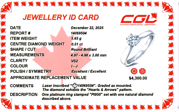 14K white gold solitaire engagement ring featuring a 0.51 carat round brilliant cut Canadian diamond.