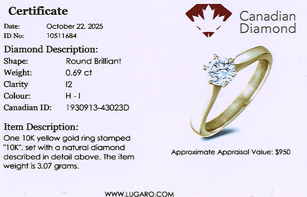 10K yellow gold solitaire engagement ring featuring a 0.69 carat round brilliant cut Canadian diamond.