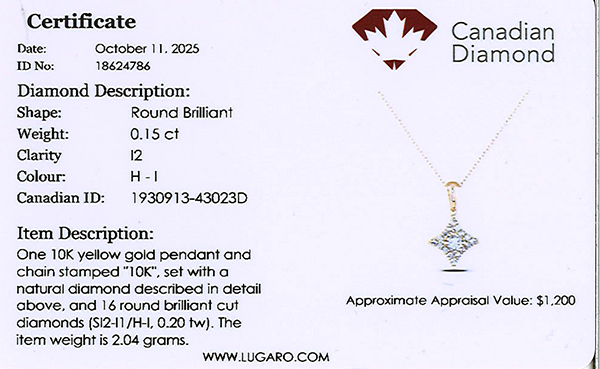 10K yellow gold pendant featuring a 0.15 carat round brilliant cut Canadian diamond, accented by 0.20 carat total weight round brilliant cut melee diamonds.