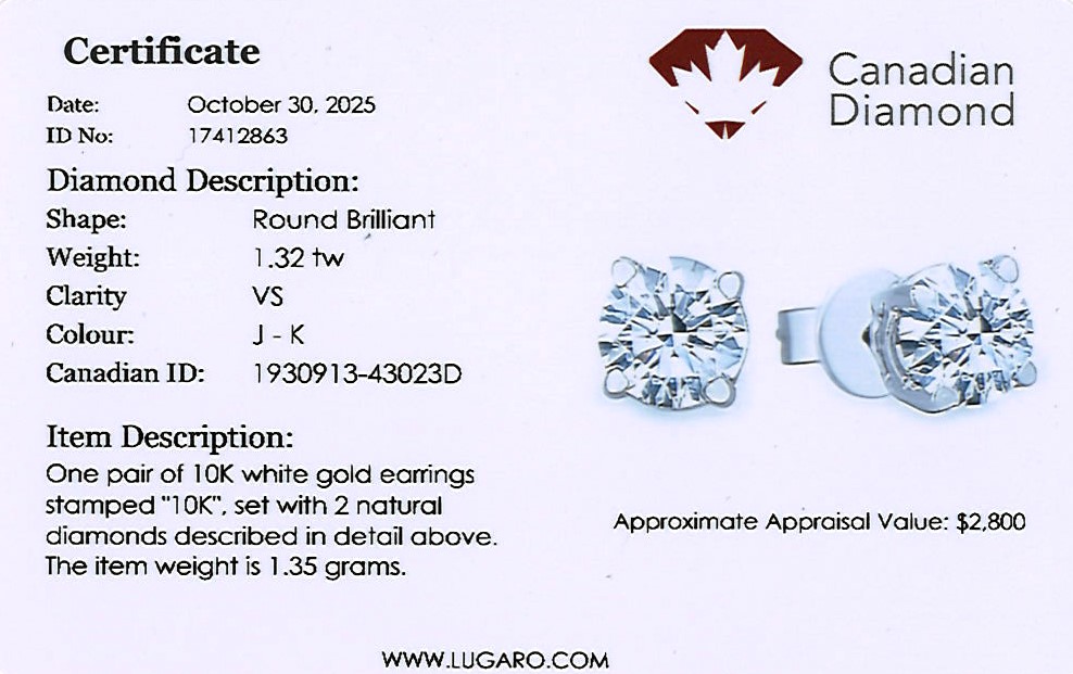 10K white gold diamond studs earrings featuring  1.32 carat total weight round brilliant cut Canadian Diamonds.
