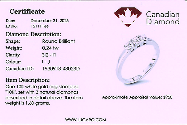 10K White gold ring featuring 0.24 carat total weight round brilliant cut Canadian diamonds.