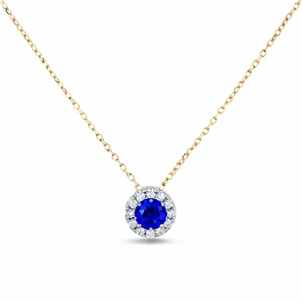 14K yellow and white gold halo pendant featuring a 0.92 carat Ceylon sapphire, accented by 0.20 carat total weight round brilliant cut diamonds.