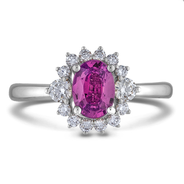 18K white gold Ceylon pink sapphire and diamond halo ring featuring a 1.03 carat oval shaped unheated pink sapphire, accented by 0.17 carat total weight round brilliant cut De Beers Forevermark diamonds and 0.20 carat total weight round brilliant cut diamonds.