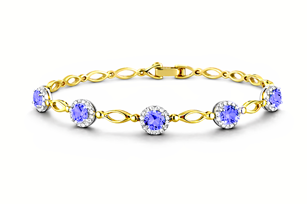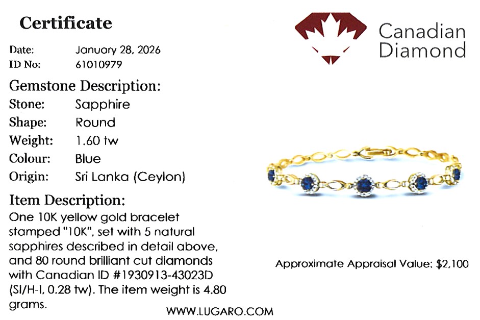 10K yellow gold bracelet featuring 1.60 carat total weight sapphire, accented by 0.28 carat total weight round brilliant cut Canadian diamonds.