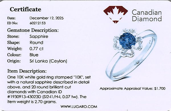 Ring includes Canadian diamond certificate.