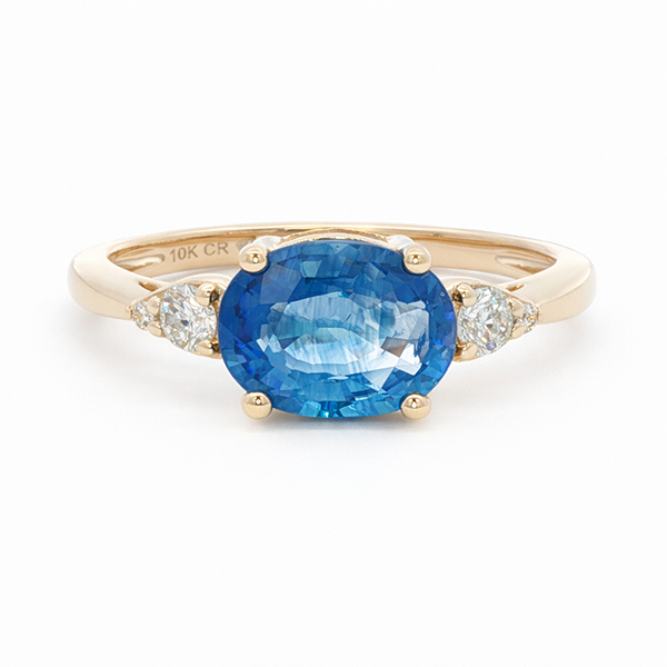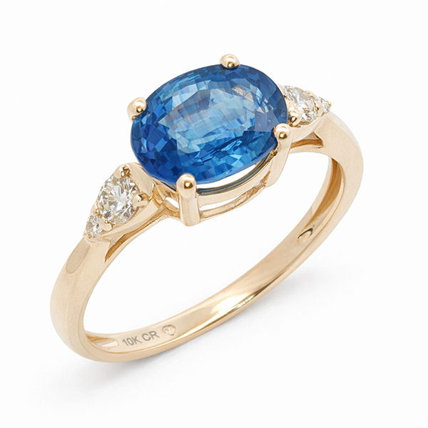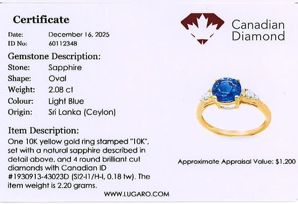 10K yellow gold ring featuring a 2.08 carat sapphire, accented by 0.18 carat round brilliant cut Canadian diamonds.