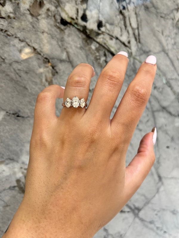 Platinum ring featuring a 2.51 carat total weight oval cut De Beers Forevermark diamonds.