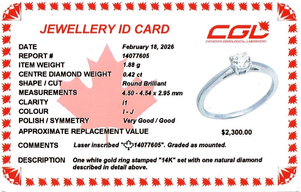 14K white gold diamond engagement ring featuring a 0.42 carat round brilliant cut Canadian diamond.