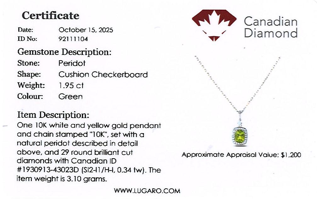 Be the first to review “Cushion Checkerboard Cut Peridot and Canadian Diamond Halo Pendant in White and Yellow Gold”