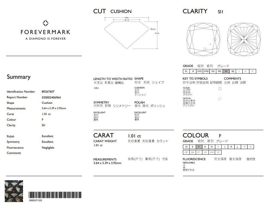 Diamond engagement ring includes De Beers Forevermark certificate.