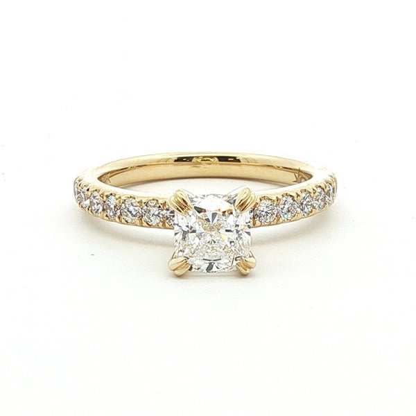 18K yellow gold engagement ring featuring a 1.01 carat cushion cut De Beers Forevermark diamond, accented by 0.40 carat total weight round brilliant cut diamonds along the shank.