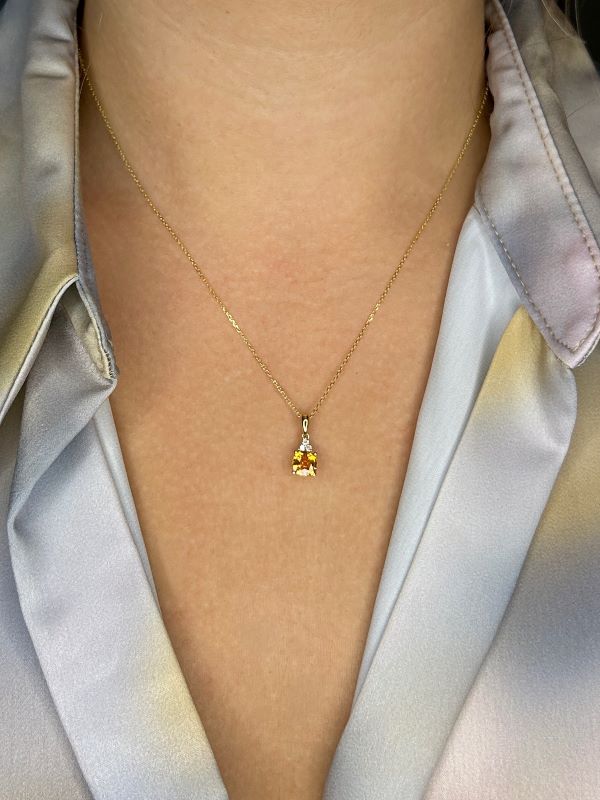 Orange sapphire and diamond pendant includes Canadian Diamond certificate.
