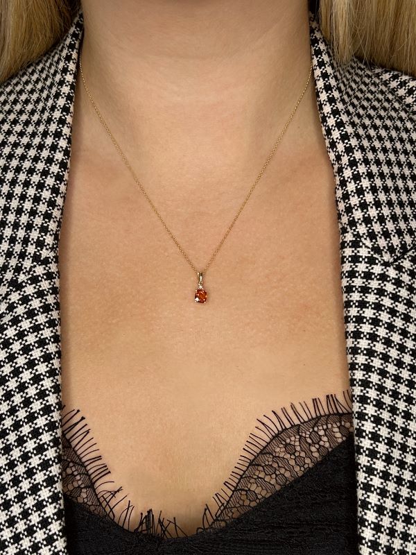 10K yellow gold orange sapphire and diamond pendant featuring a 0.89 carat cushion cut orange sapphire, accented by 0.04 carat round brilliant cut Canadian diamonds.