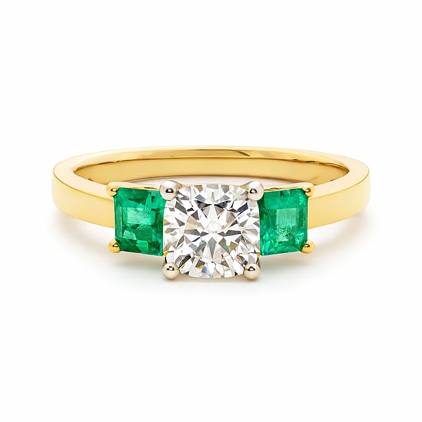 18K yellow gold three stone ring, featuring a 0.40 carat Brazilian emerald, accented by 0.93 carat total weight ideal cushion cut De Beers Forevermark diamond.