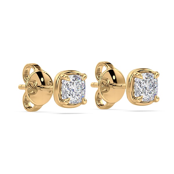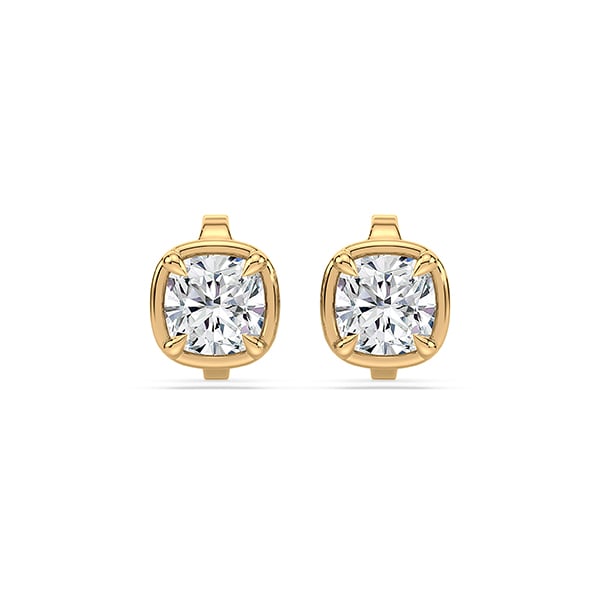 18K yellow gold bezel set solitaire earrings featuring a 1.43 carat total weight ideal cushion cut De Beers Forevermark diamond.