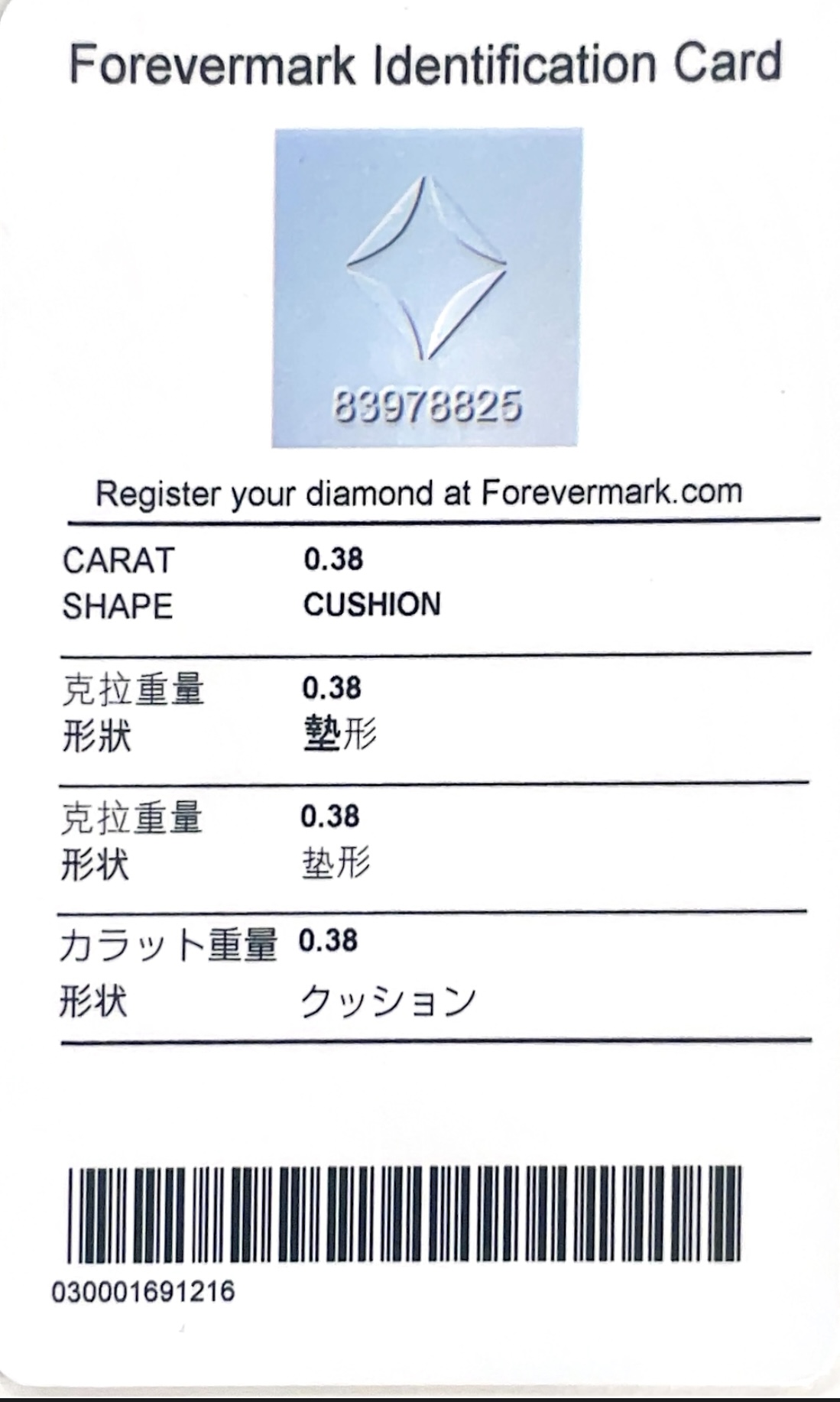 • Certificate: De Beers Forevermark