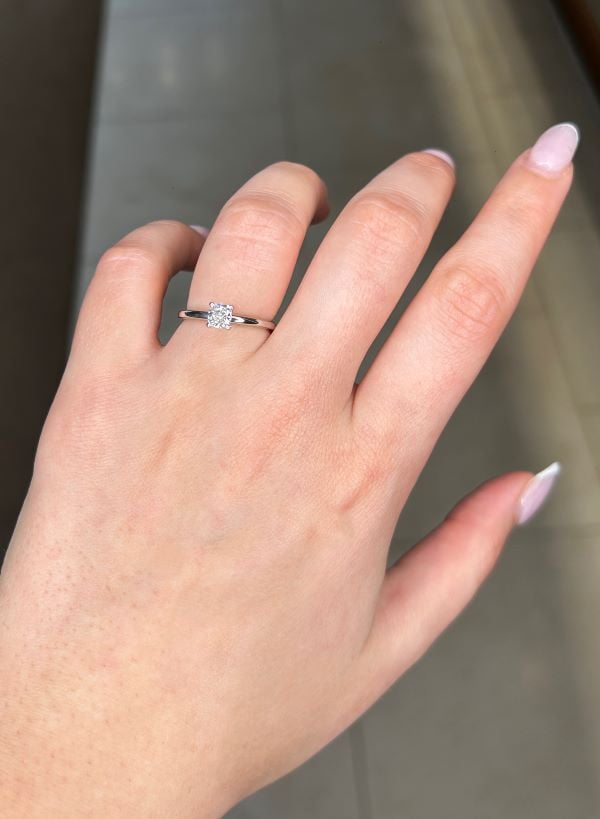 14K white gold engagement ring featuring 0.55 carat cushion cut De Beers Forevermark diamond.