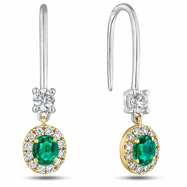 18K yellow and white gold drop earrings featuring 0.68 carat total weight emerald, accented by 0.18 carat total weight round brilliant cut De Beers Forevermark diamonds and 0.25 carat total weight melee diamonds.