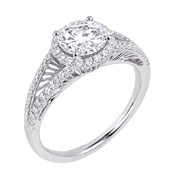 14K white gold diamond ring featuring a 0.76 carat De Beers Forevermark diamond, accented by 0.40 carat total weight round brilliant cut melee diamonds.