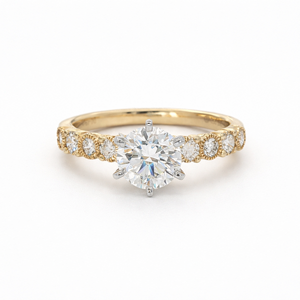 18K yellow and white gold ring featuring a 1.00 carat De Beers Forevermark diamond, accented by 0.49 carat total weight round brilliant cut melee diamonds.