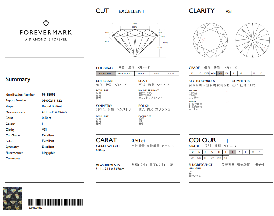 Platinum ring featuring a 0.50 carat round brilliant cut De Beers Forevermark diamond, accented by 0.03 carat round brilliant cut diamonds.