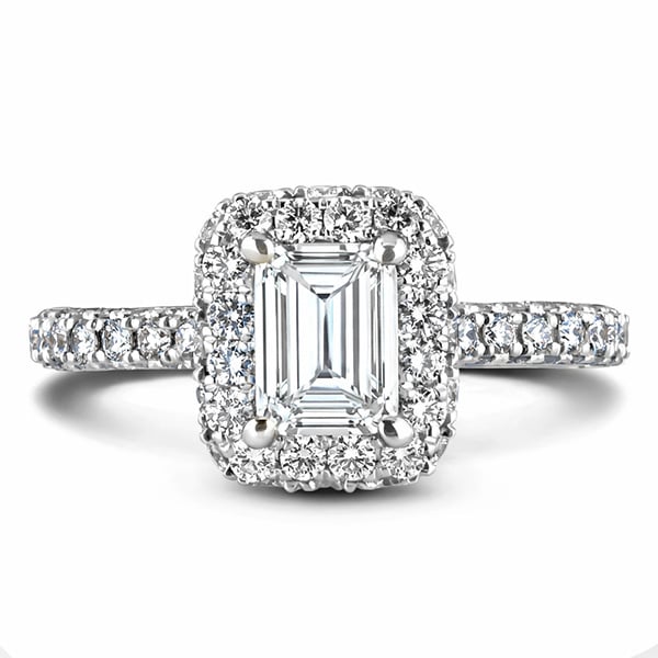 18K white gold engagement ring featuring a 1.01 carat De Beers Forevermark diamond, accented by 1.32 carat total weight round brilliant cut diamonds in a hidden halo and accents along the shank.