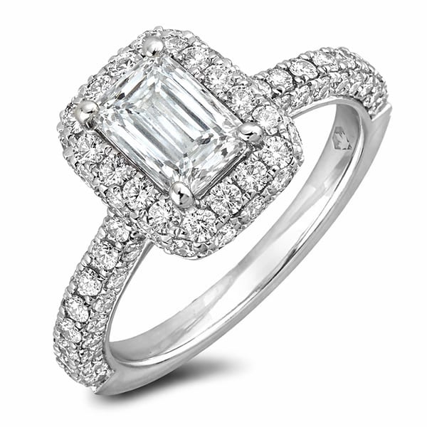 Halo diamond engagement ring includes De Beers Forevermark certificate.
