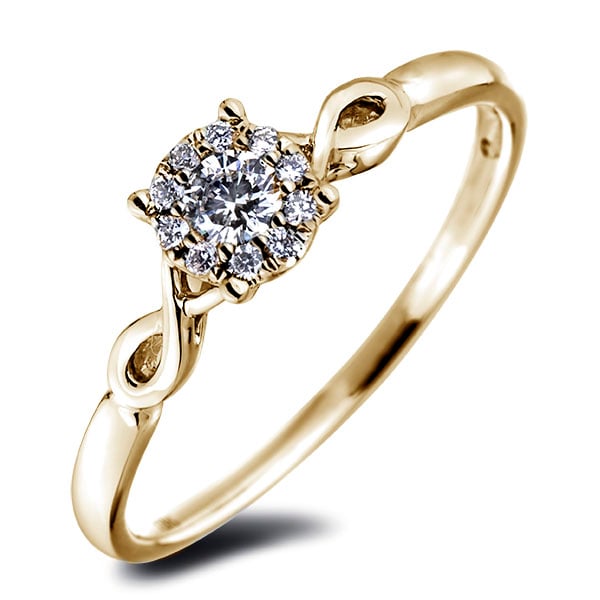 14K yellow gold ring featuring a 0.10 carat round brilliant cut De Beers Forevermark diamond, accented by 0.05 carat total weight round brilliant cut diamonds.