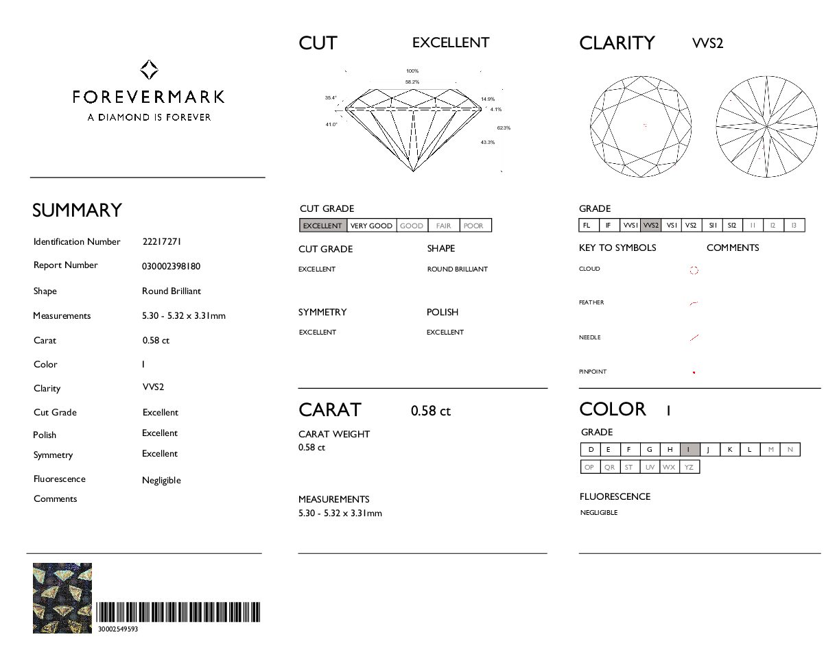 18K yellow and white gold diamond ring featuring a 0.58 carat round brilliant cut De Beers Forevermark diamond, accented by 0.12 carat total weight round brilliant cut diamonds.