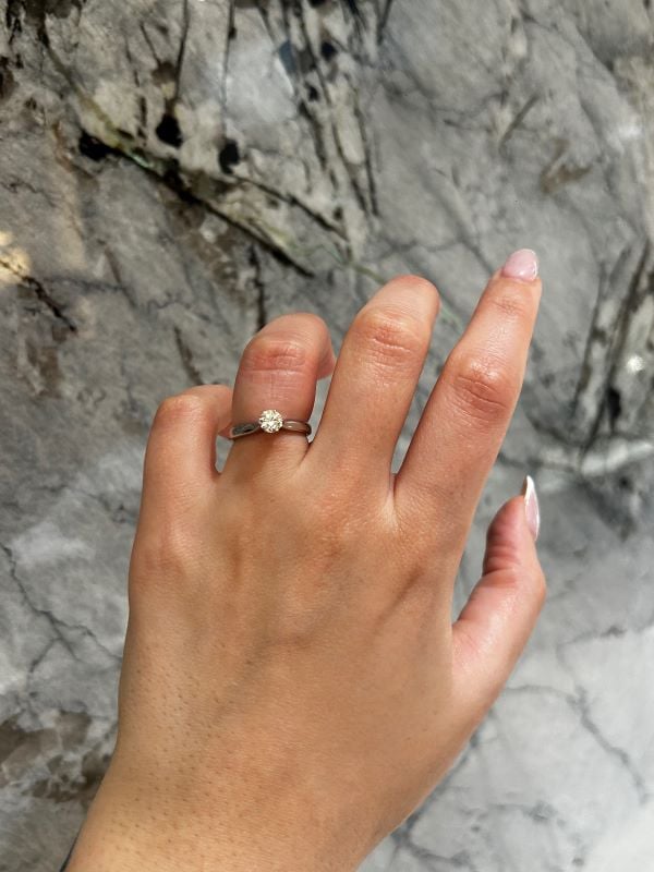 Solitaire diamond engagement ring includes De Beers Forevermark certificate.