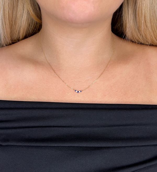 10K yellow gold curve necklace featuring 0.10 carat total weight round cut sapphires, accented by 0.06 carat total weight round brilliant cut diamonds.