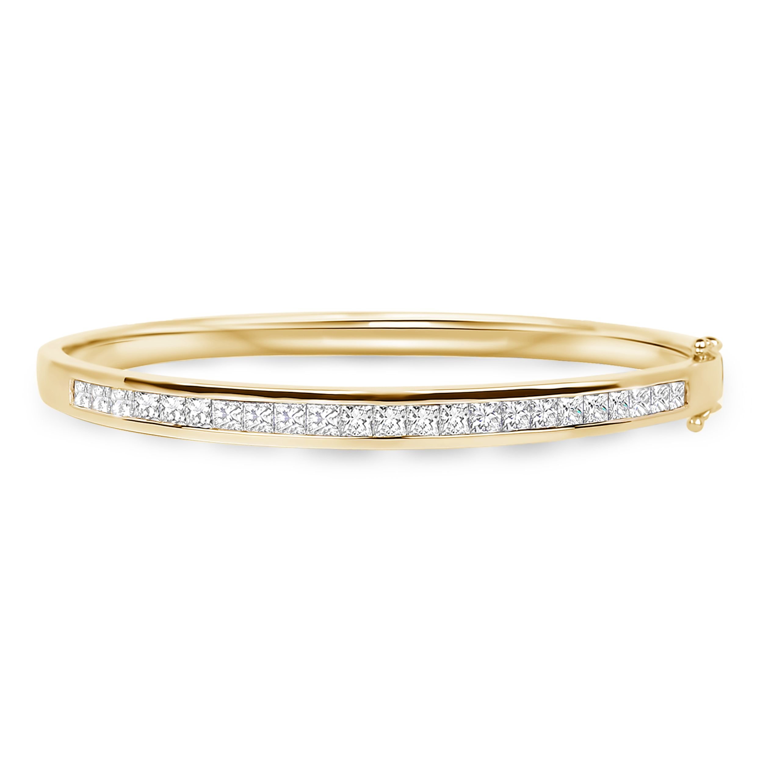 14K yellow gold diamond bangle bracelet featuring 2.84 carat total weight princess cut diamonds.