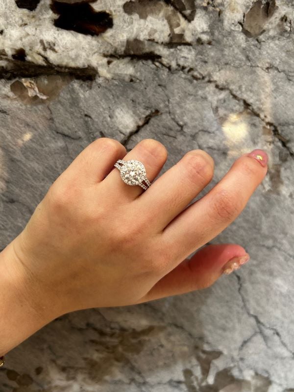 18K white gold diamond halo engagement ring featuring a 2.00 carat round brilliant cut certified diamond, accented by 1.02 carat total weight round brilliant cut diamonds. Certified diamond halo ring includes Gem Scan Laboratories certificate. Book a consultation with our diamond specialist for more details.