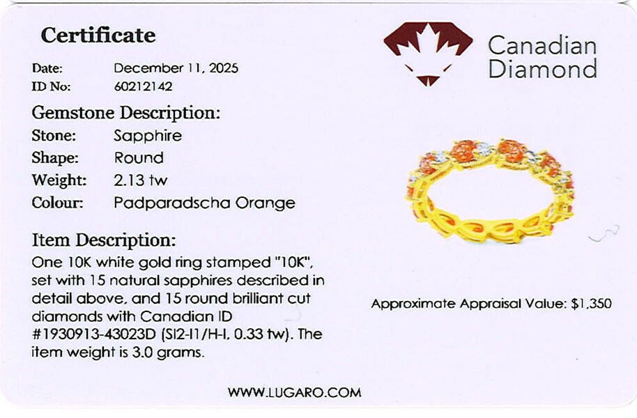 Be the first to review “Elegant Padparadscha Orange Color Sapphire and Canadian Diamond Eternity Ring in Yellow Gold”