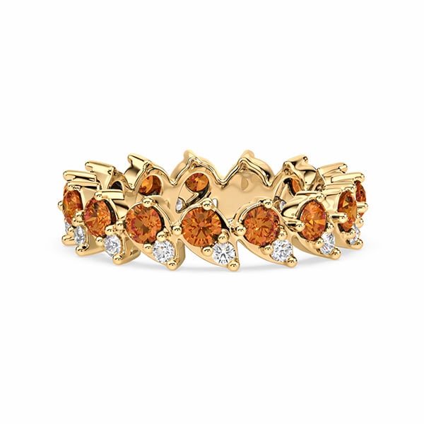 10K yellow gold eternity ring featuring 0.33 carat total weight round brilliant cut Canadian diamonds, accented by 2.13 carat total weight Padparadscha Orange Color Sapphire.