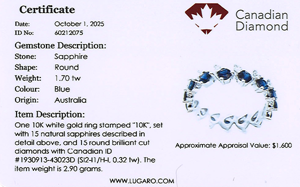 Eternity ring includes Canadian diamond certificates.