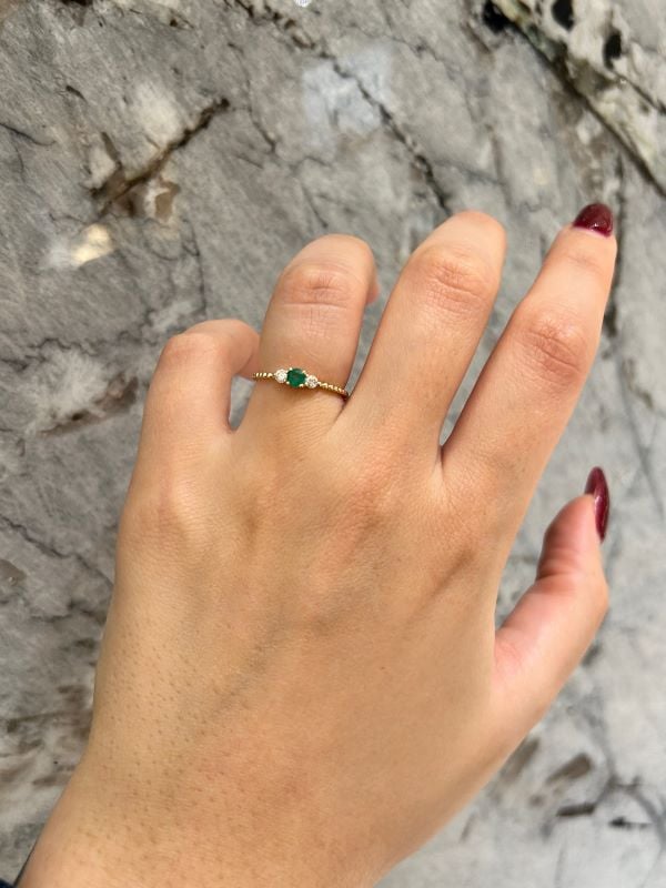 Emerald and Canadian Diamond Beaded Style Dainty Ring in Yellow Gold