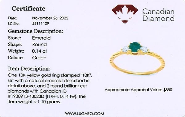 10K yellow gold ring featuring a 0.14 carat round brilliant cut Canadian diamond, accented by 0.14 carat total weight emerald.