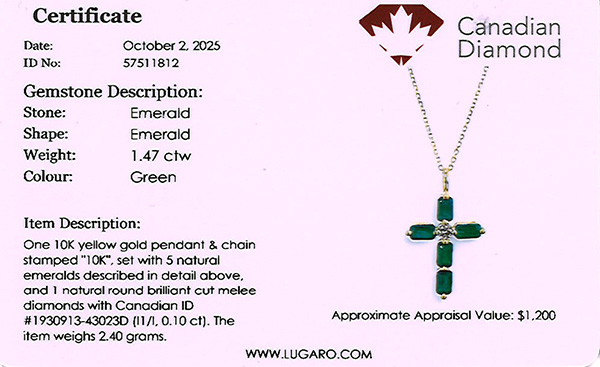10K yellow gold cross pendant featuring 0.10 carat round brilliant cut Canadian diamond, accented by 1.47 carat total weight natural emerald.