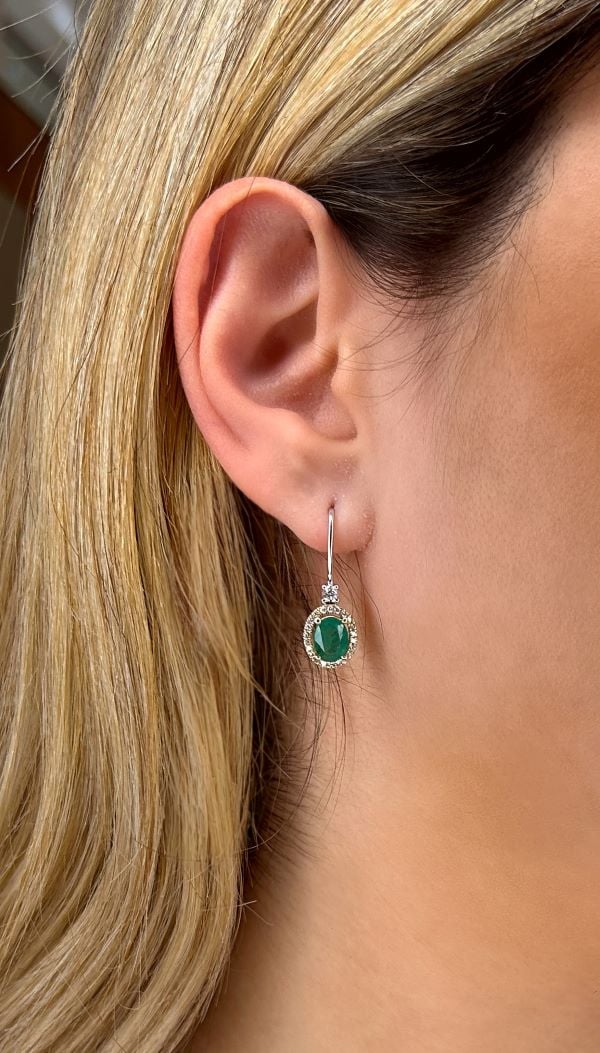 Be the first to review “Emerald and Canadian Diamond Halo Dangle Drop Earrings in White and Yellow Gold”