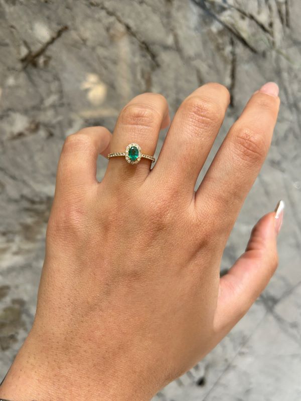 Emerald and Canadian Diamond Halo Oval Cut Ring In Yellow Gold