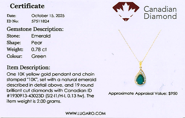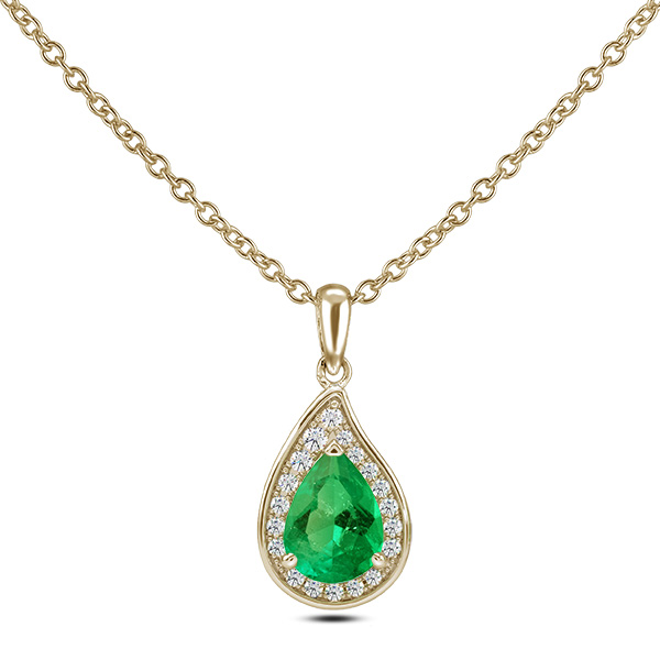 Be the first to review “Emerald and Canadian Diamond Pear Shape Halo Pendant in Yellow Gold”