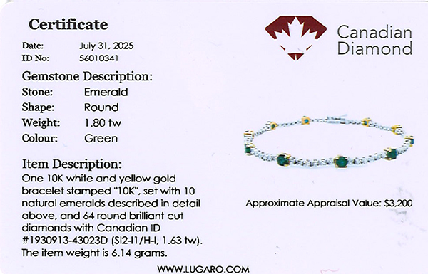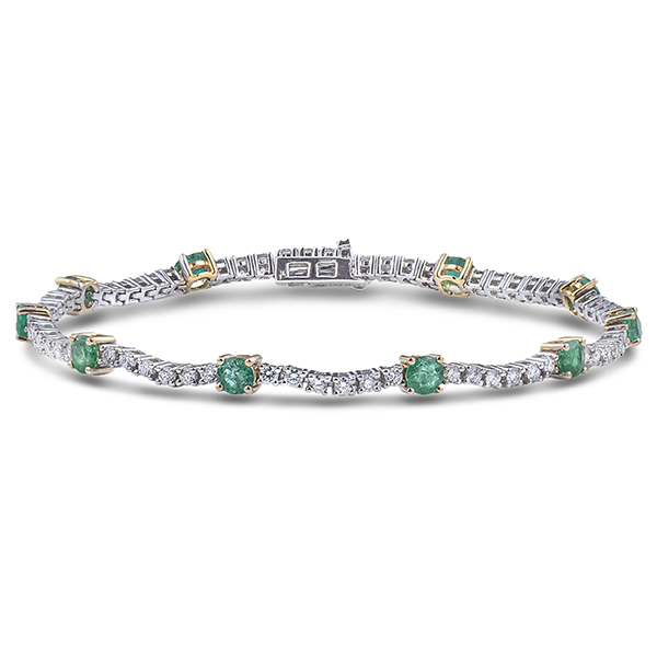 10K white and yellow gold tennis bracelet featuring 1.80 carat total weight emerald, accented by 1.63 carat total weight round brilliant cut Canadian diamonds.