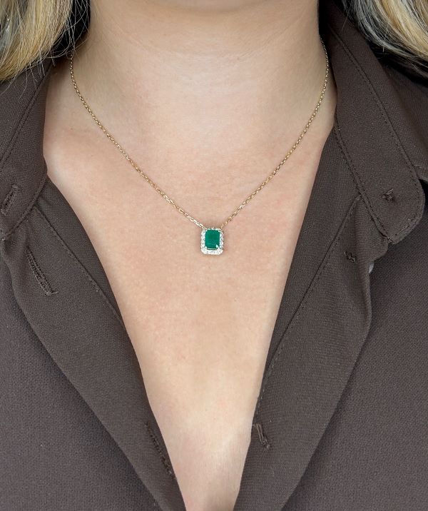 Be the first to review “Emerald Shape Emerald and Canadian Diamond Halo Pendant in Yellow Gold”