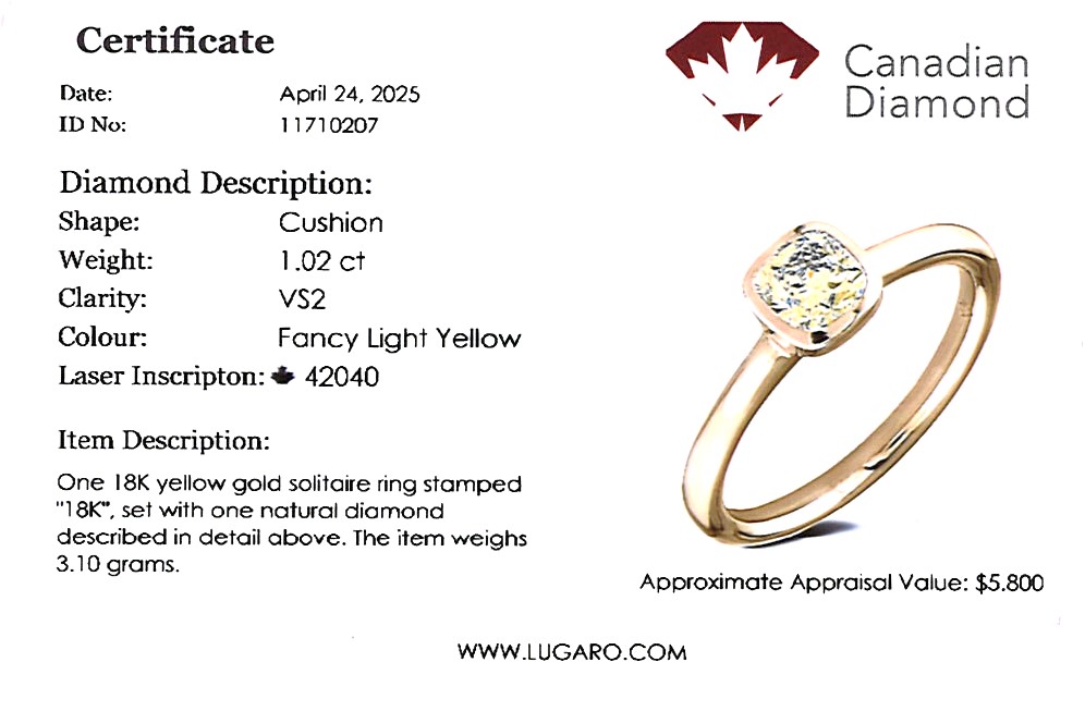 Solitaire ring includes a Canadian diamond certificate.