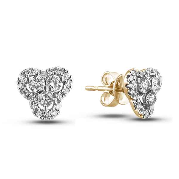 10K yellow gold halo clover stud earrings featuring 0.42 carat total weight round brilliant cut Canadian diamonds.